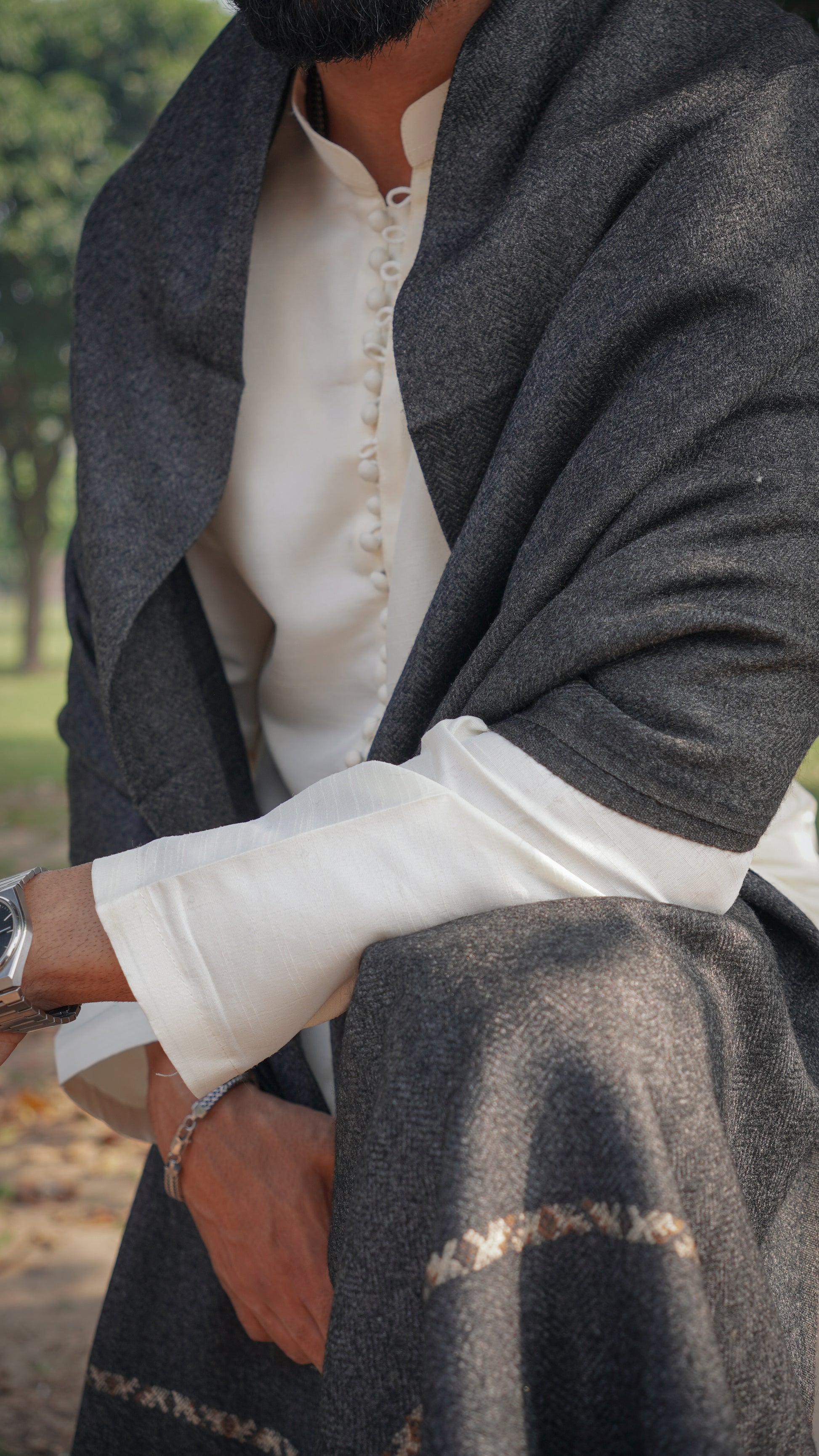 The deep grey tone exudes sophistication and versatility, pairing effortlessly with both eastern and western attire. Subtle yet striking, it’s a piece that defines quiet confidence.